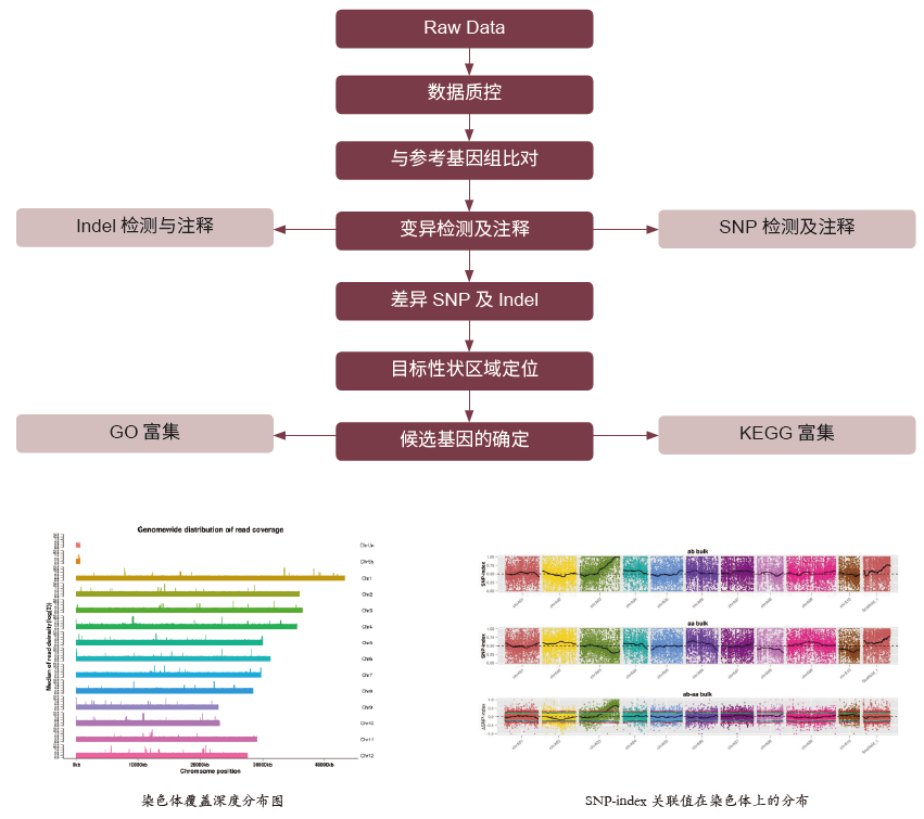 混合分组分析法(Bulked-segregant analysis,BSA),选择表型极端差异的亲本构建家系,对该家系目标性状表型极端的子代个体分别混合得到的两个样本池进行全基因组重测序,检测两池间DNA 差异片段,可进一步定位到目标性状相关的基因或标记。该方法主要应用于质量性状单基因或控制数量性状的主效基因的分析,理论上适用于任何发生性状分离的家系群体,具有周期短、定位准、性价比高的优势,通常一次BSA 标准分析仅能定位一个性状。