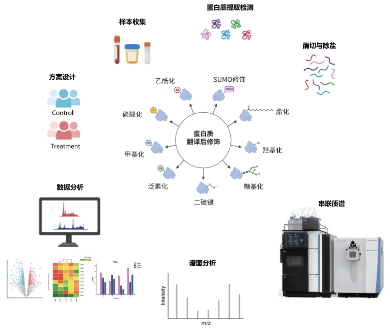 蛋白质氨基酸序列的特定位置可以与化学基团或者小分子量的蛋白共价结合从而发生蛋白质翻译后修饰(posttranslational modifications,PTMs),包括磷酸化、乙酰化、泛素化、甲基化等,影响细胞生物学的几乎所有方面。修饰蛋白组学基于修饰类型和水平,采用不同的富集方法和质谱检测方法,对蛋白质修饰状态进行定性定量分析,获得不同处理或不同生理、病理状态下的蛋白修饰差异,对揭示生命活动的机理、筛选疾病的临床标志物、鉴定药物靶点等方面都具有重要意义。