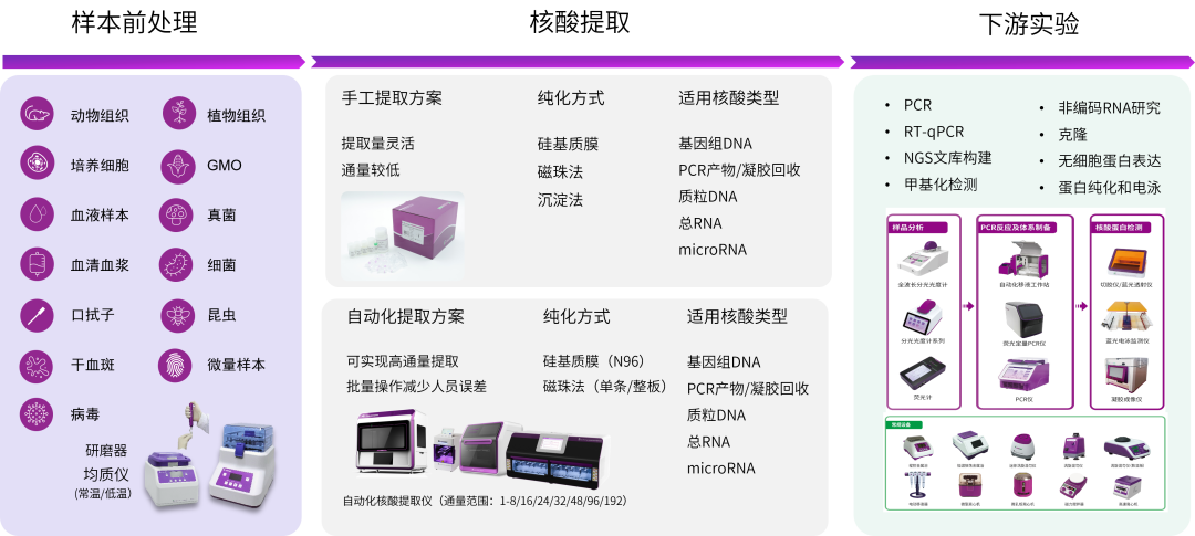 20年来,我们不断丰富产品线,为客户提供从样本保存、前处理、核酸提取,到下游各类检测的完整解决方案。让实验操作更简单、更快速、更安全,让高通量自动化走入更多的实验室,满足大型企业和研究型实验室的不同需求。
