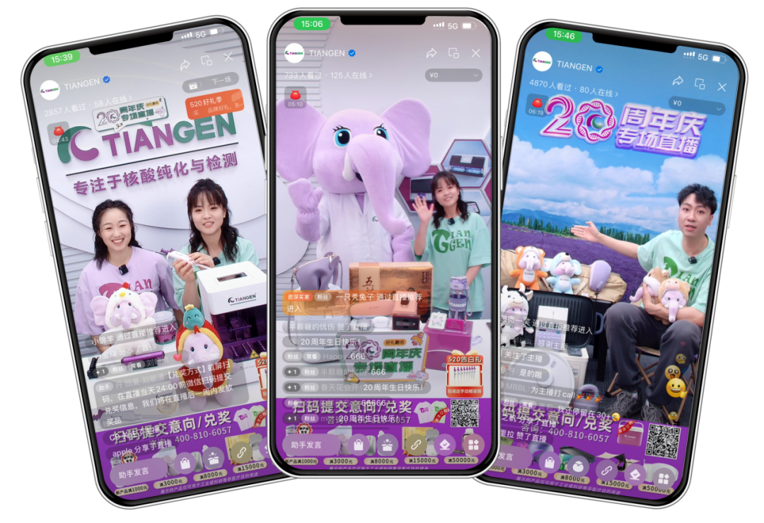 为庆祝20周年,TIANGEN直播间每个月的20号都会举办周年庆专场直播,在直播间提交意向并完成订单就可以获赠生肖吉象玩偶,还有丰富的互动和订购好礼,吸引了大量的粉丝参与。